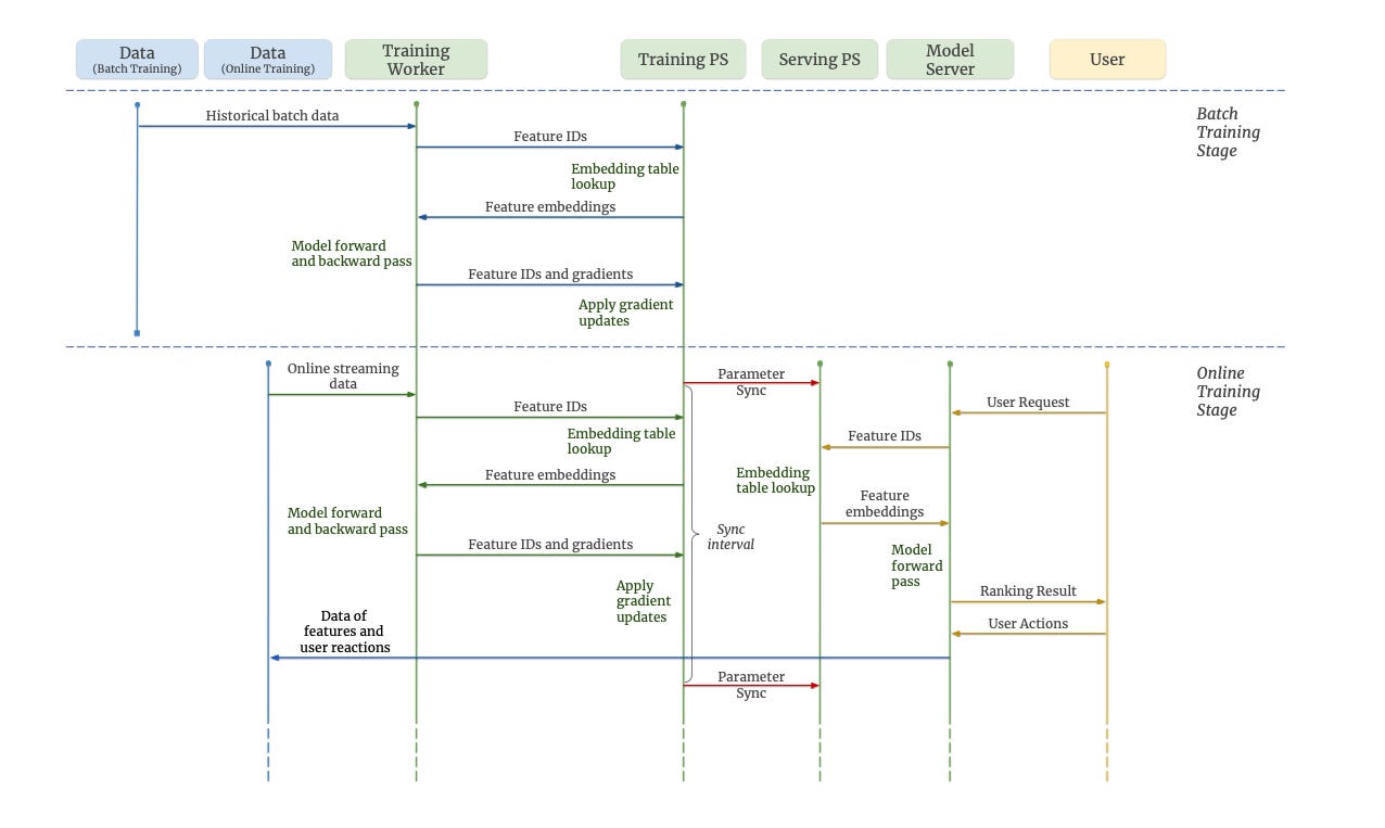 Once the model is deployed for online serving, training doesn’t stop—it switches to the online training stage.