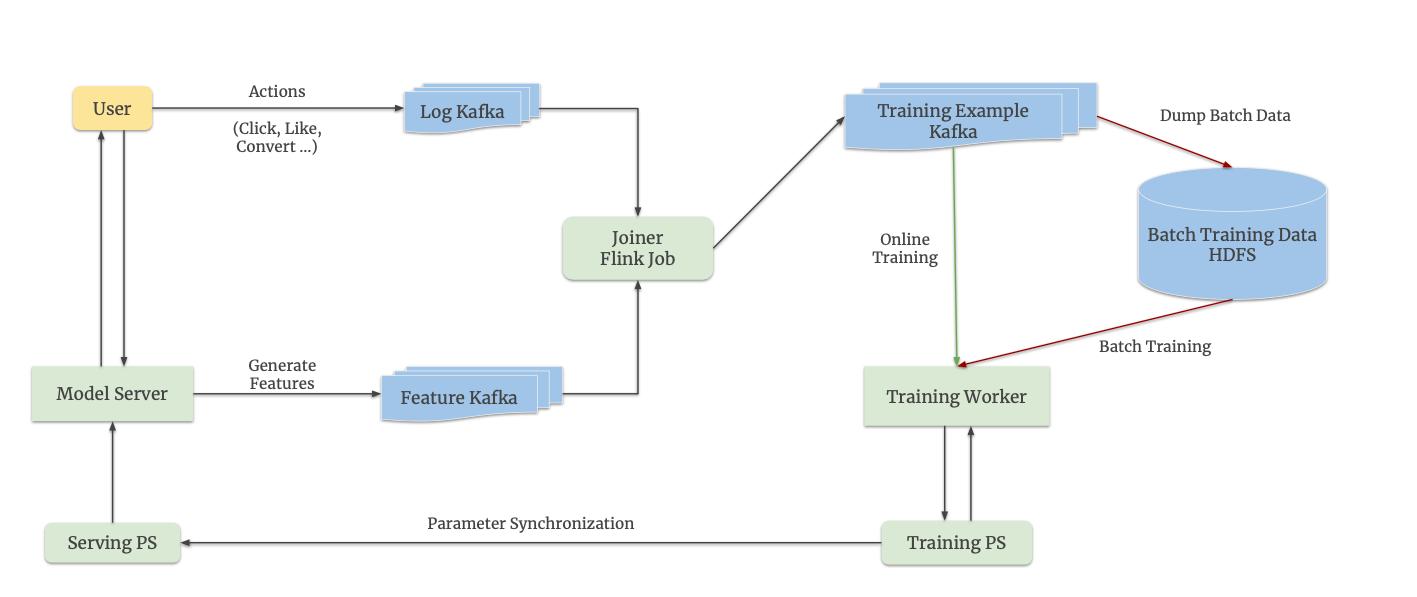 Online Training: The training worker directly reads training examples from the Kafka queue in real-time.