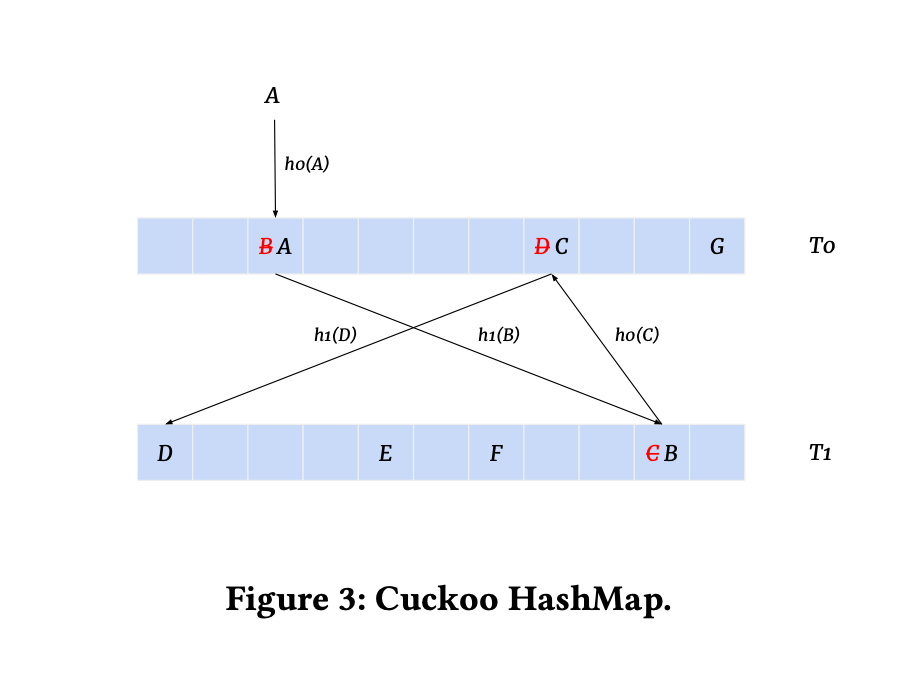 It maintains two hash tables (T0 and T1) with different hash functions (h0 and h1).