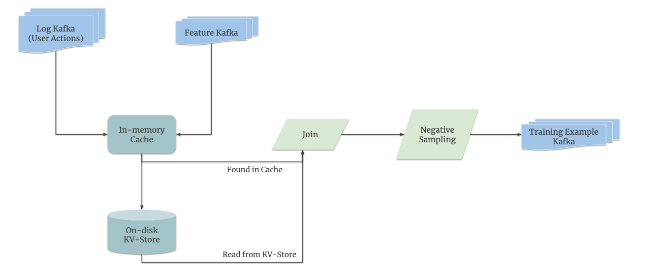 Monolith uses an on-disk key-value storage to store features that haven’t been paired with user actions yet. When a user action arrives, the system first checks the in-memory cache and then the on-disk storage if the feature isn’t found in memory.